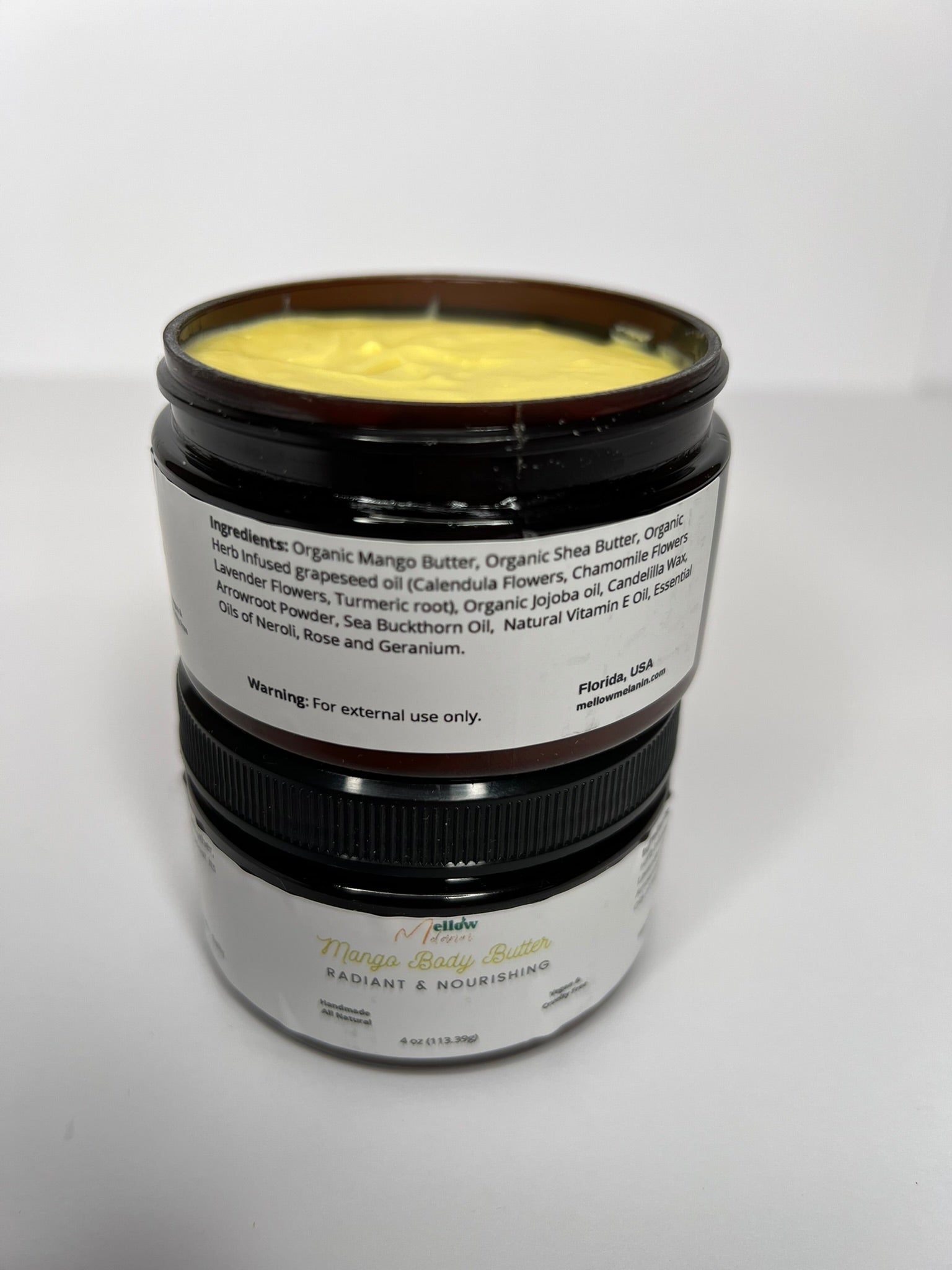 This Luxurious Whipped Mango Body Butter is handmade. Our nourishing mango body butter helps to maintain softer, smoother and radiant skin. It will nourish your skin's elasticity. It is infused with organic skin-loving herbs. Made for all skin types.
